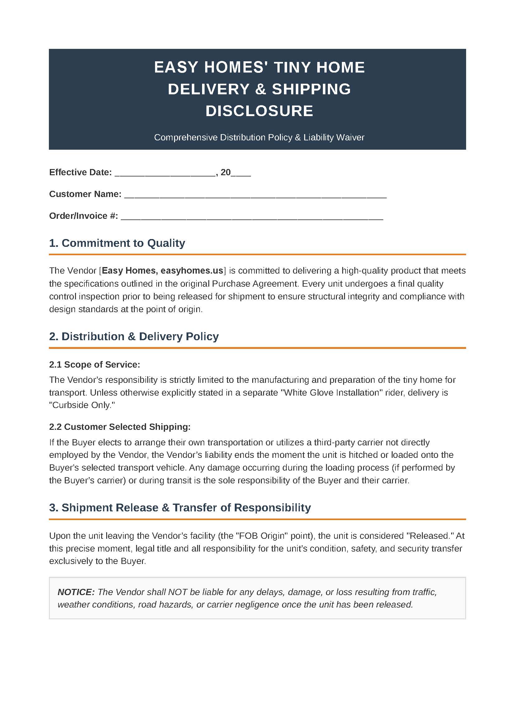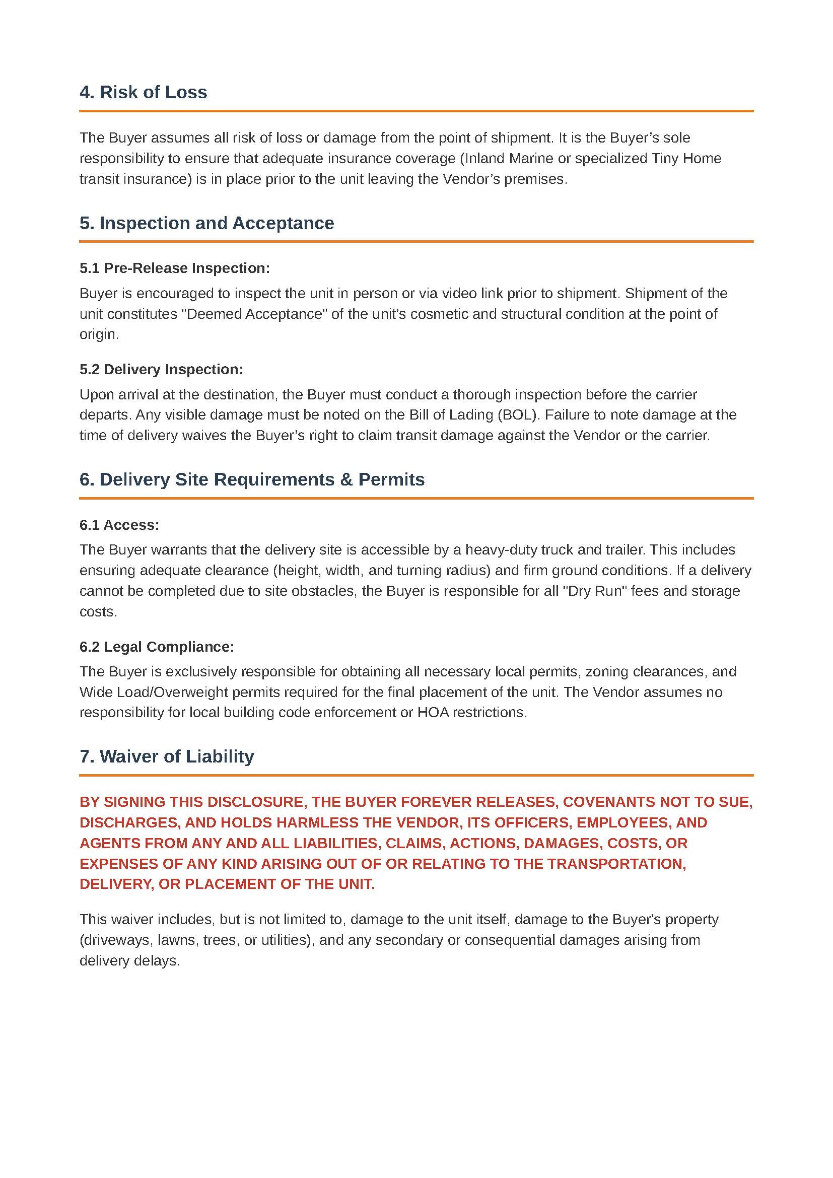 By completing the purchase of a tiny home from our company, signing any delivery receipt, or accepting physical possession of the unit, the buyer acknowledges that they have read, understood, and agreed to all terms and conditions set forth in this Delivery & Shipping Disclosure Policy in its entirety.